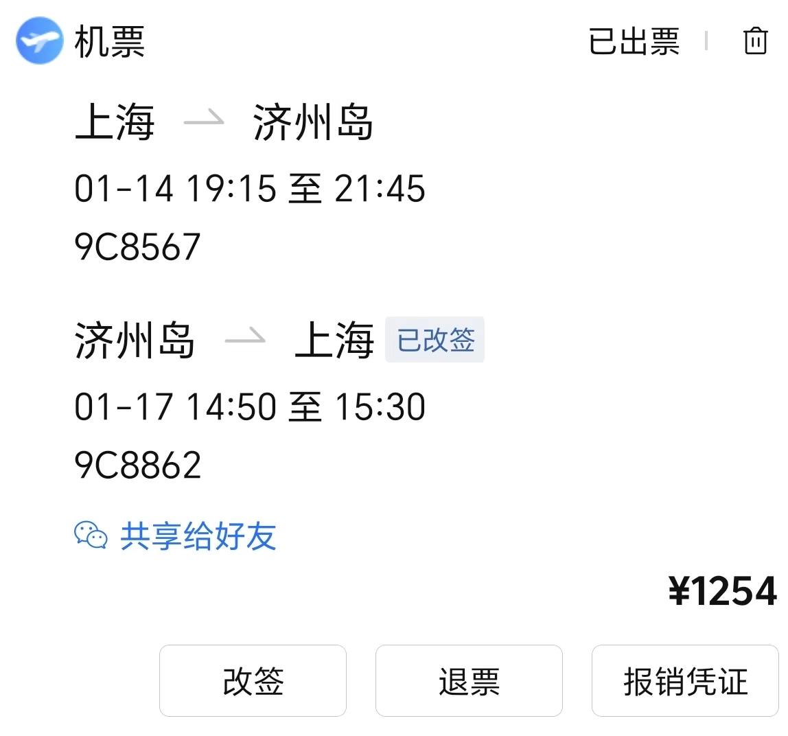 我平时有个习惯,就是时不时会刷各个平台的机票价格。因为济州岛是免签的,而且往返航班比较多,价格也比较实惠,再加上离国内近,所以买机票的选择余地挺大的。那时候我是在2024年11月6号的晚上9点多买的机票,价格相对来说也挺便宜的——往返机票才600多,两个人加起来1200多。既然机票价格这么合适,我就直接订了。