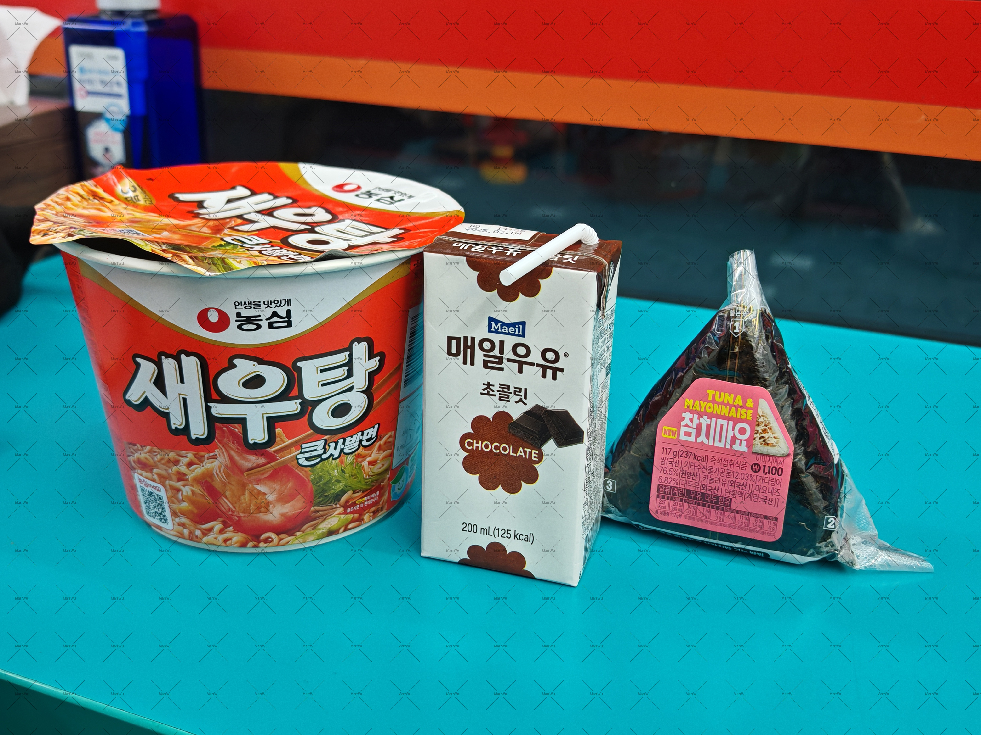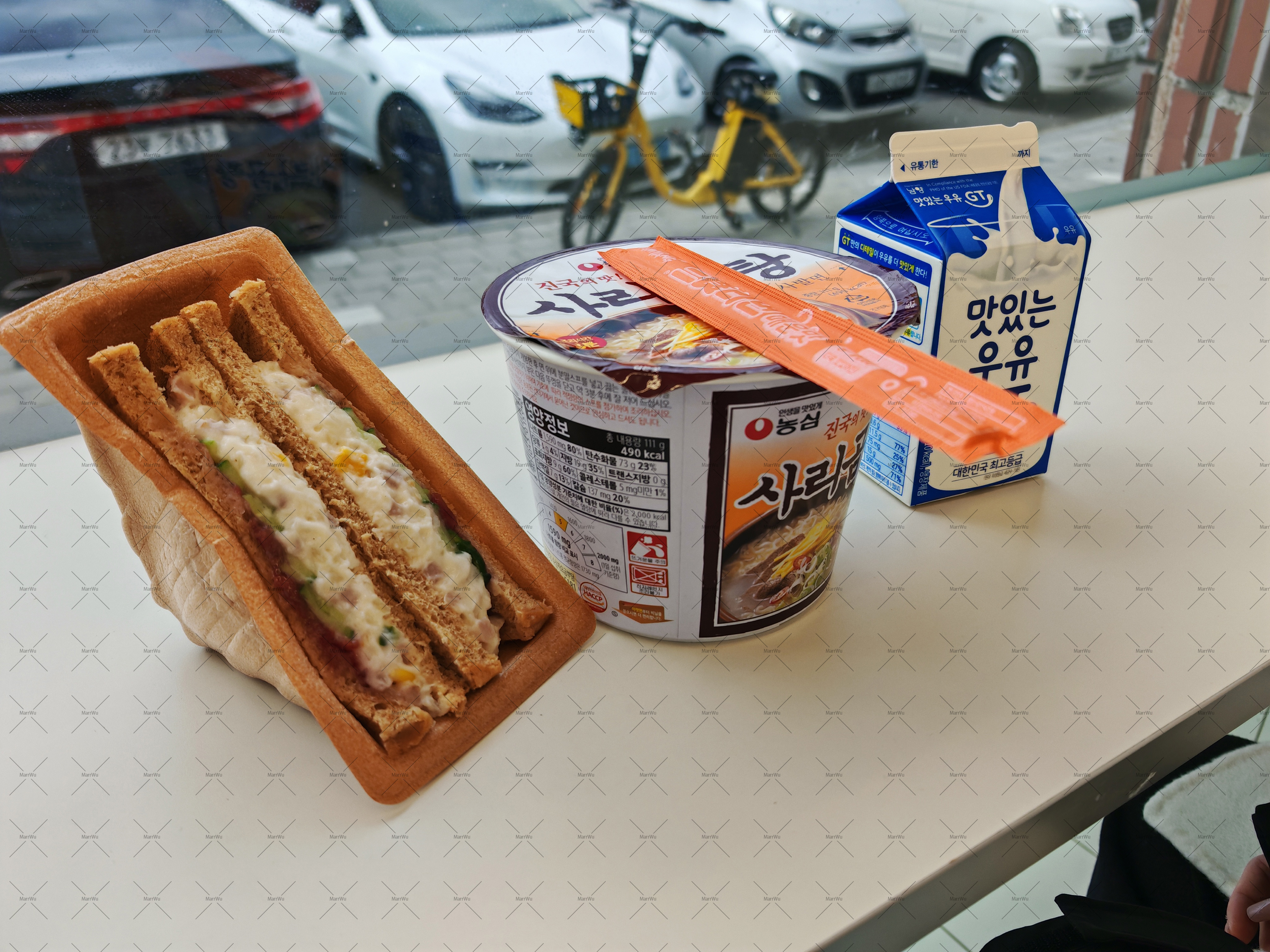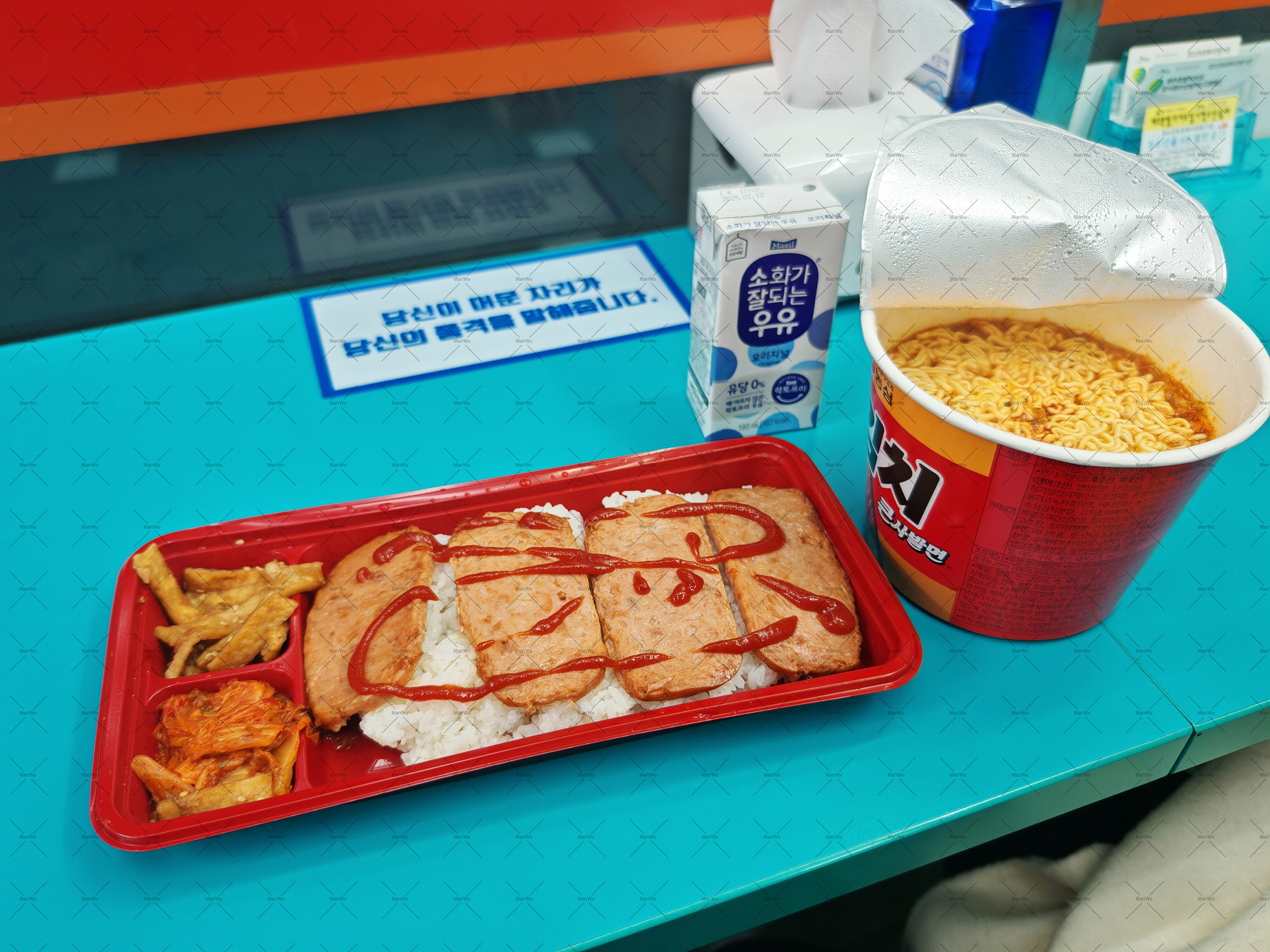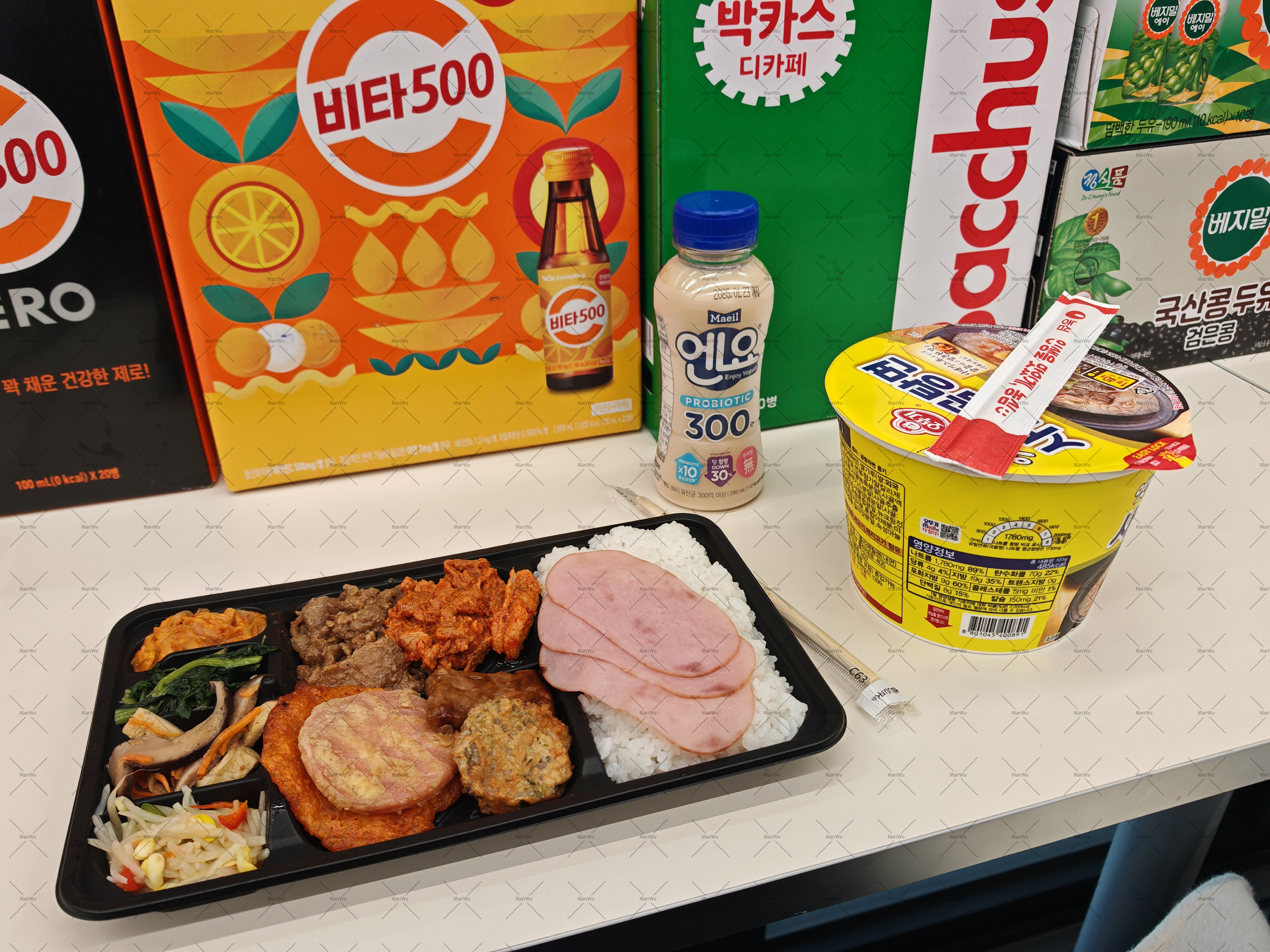 跟大家简单说一下吧,我们去的便利店呢就是两家CU和GS25。这两家便利店呢,其实是差不多的,就好比在国内我们能看到罗森,十足这样的,便利店吧,也没有什么特别的,东西也都差不多。我们这几天早餐一般会有牛奶,然后三明治,然后泡面什么的。不得不说韩国的泡面味道是真不错,但是不能经常吃,因为真的容易吐,吃多了会腻,一桶泡面其实价格还好,7块钱有时候会有活动,比如说两桶会有个打折。然后还有饭团,饭团我觉得其实一般,三明治的话还可以,还有便当,便当一份的价格差不多在25块钱左右,就是一些预制的,然后放进去。韩国人胃口很小吗?这个便当里的饭两口就没了。总体来说吃便利店肯定是最便宜的。